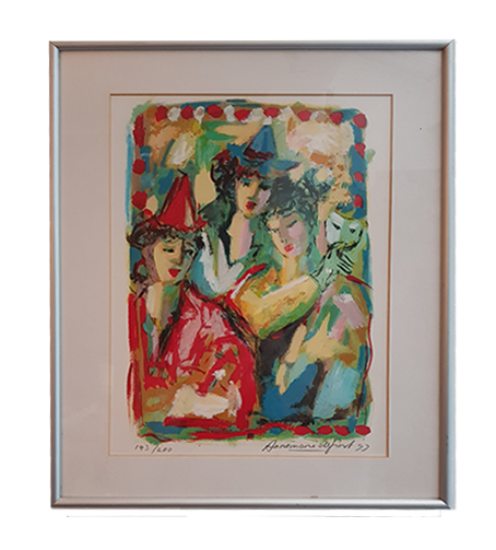 Annemarie de Groot (1949 – ) – [zonder titel] (hand gesigneerde en genummerde prent, 1999, 193/200) Kleurrijk, expressief werk van de Nederlandse kunstenares. Figuratieve voorstelling met drie feestelijke figuren en masker.