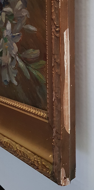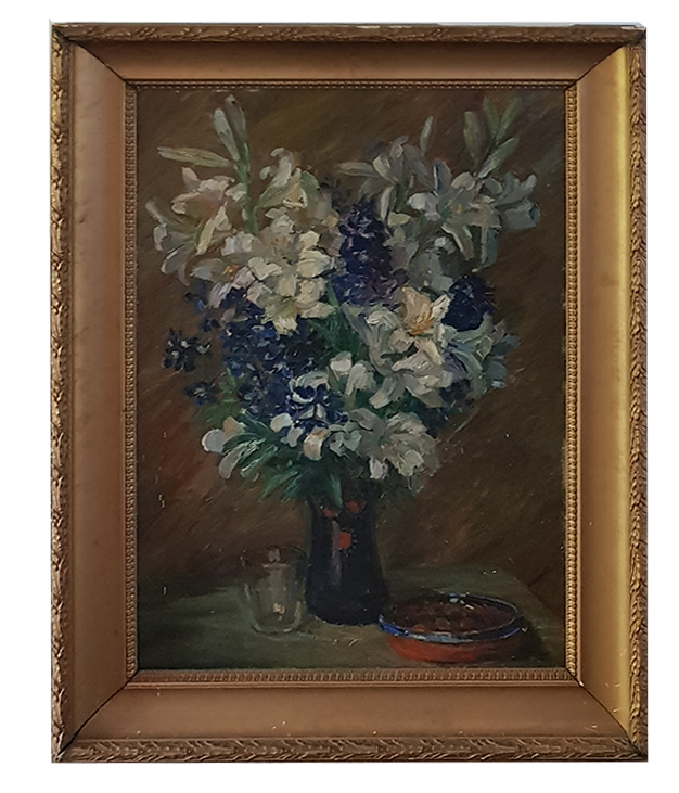 Brionnet (20e eeuw), schilder van bloemstillevens. Olieverf op doek met een rijke voorstelling van witte en blauwe bloemen in een vaas, met glas en schaaltje op de voorgrond. Gesigneerd rechtsonder.