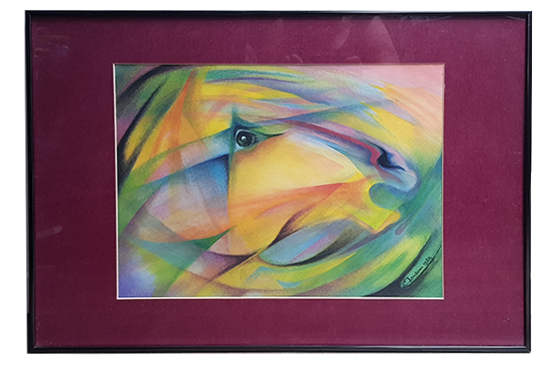 Emmelies Jordens – [zonder titel] origineel werk, pastel/gemengde techniek op papier, 1989. Kleurrijk abstract-figuratief werk. Gesigneerd en gedateerd 1989, met dynamische kleurvlakken waarin oog en gezichtsprofielen te herkennen zijn.