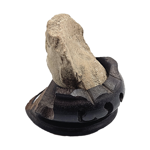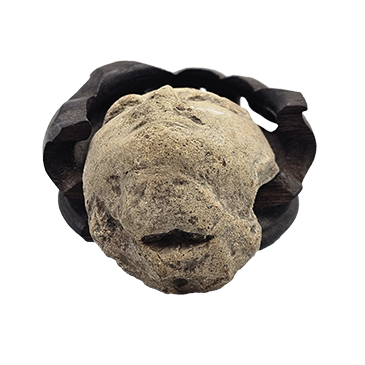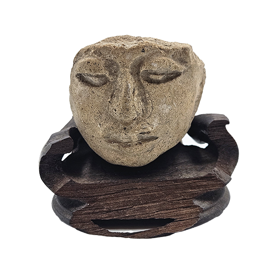 Klein gezichtsfragment uit zandsteen, rustend op een houten sokkel. Het eenvoudige, bijna meditatieve gelaat heeft gesloten ogen en zachte gelaatslijnen. De achterkant is ruw, wat erop wijst dat het oorspronkelijk deel was van een groter geheel.