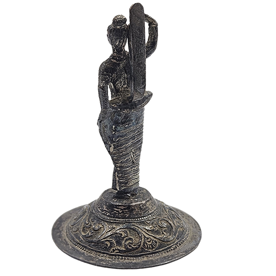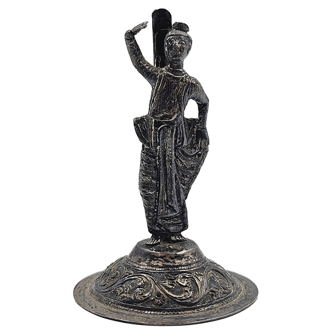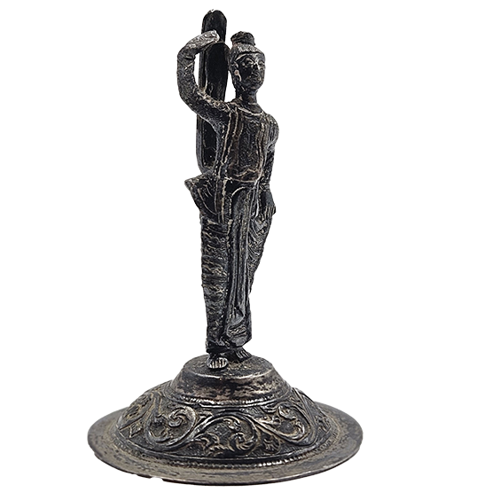 Klein, gedetailleerd beeldje van een staande Boeddha met opgeheven hand in zegenend gebaar. De basis is rijk versierd met florale motieven. Waarschijnlijk afkomstig uit Thailand of Laos. Mooi patina door ouderdom en gebruik.