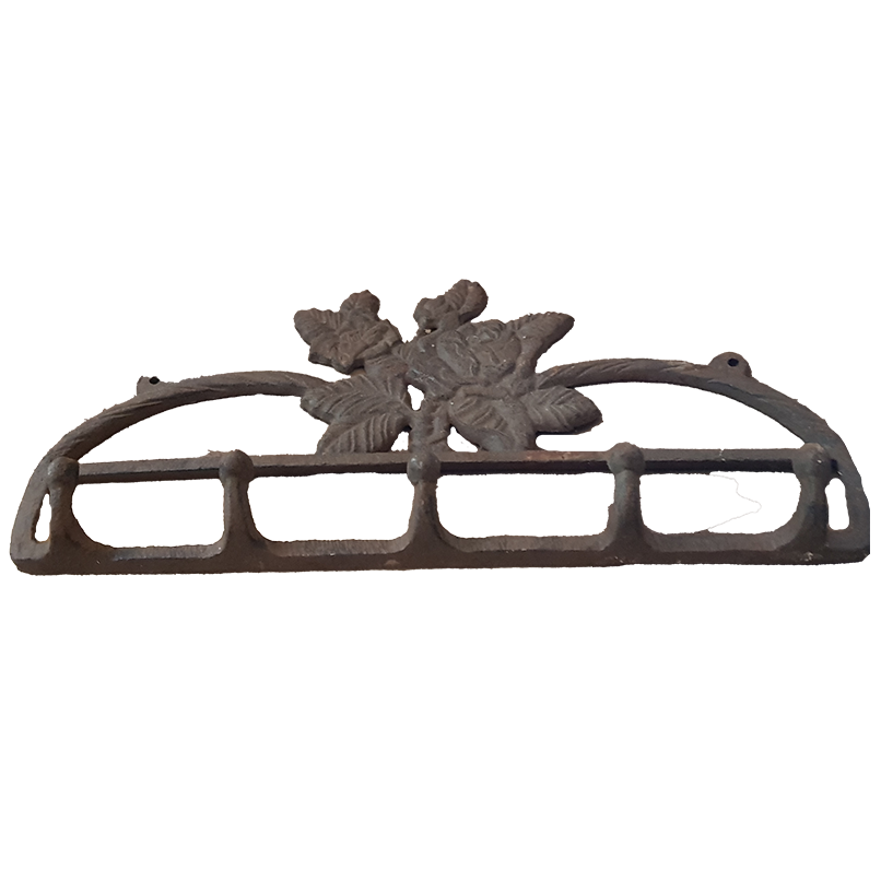Gietijzeren wandhaak met rozenmotief. Vier dubbele haken onder een sierlijke boog met reliëfdecoratie van bladeren en rozen. Donker verweerd patina. Decoratief en functioneel, geschikt voor hal, keuken of tuin.