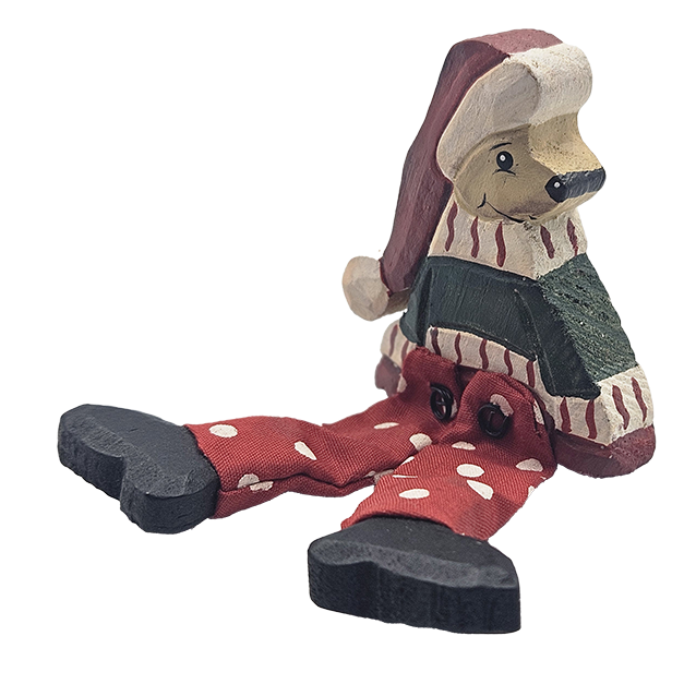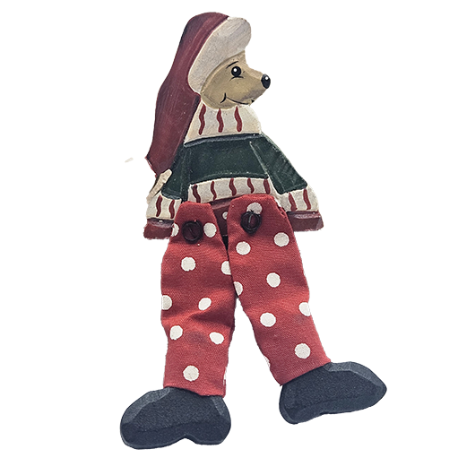 Sfeervol houten kerstfiguurtje met stoffen broek en kerstmuts. Leuk om neer te zetten op een plank, vensterbank of kersttafel.