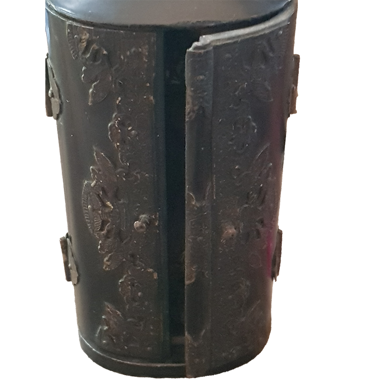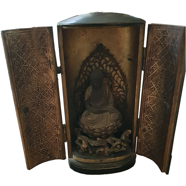 Kleine portable butsudan of reisaltaartje van hout met metalen decoratie en afneembare Boeddha. Japans of Chinees. Rijk gegraveerde deuren, Boeddha zittend op lotustroon in fijn uitgesneden nis. Antieke uitstraling.