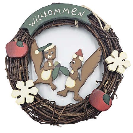 Sfeervolle houten krans met eekhoorns, appels en sneeuwbloemen. Met het opschrift Willkommen een warme begroeting voor iedere deur of wand.