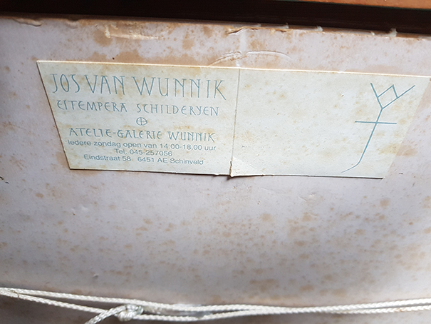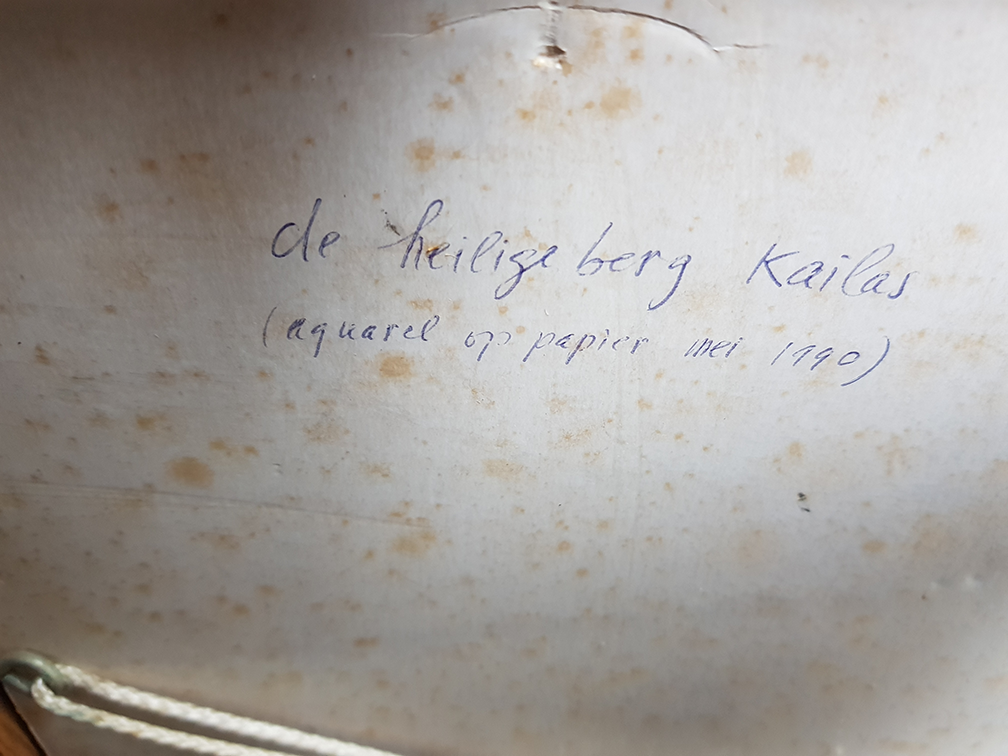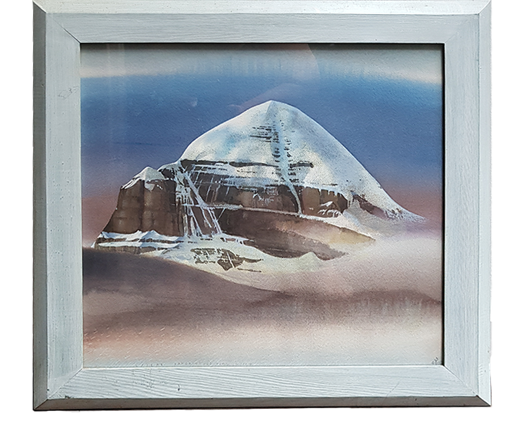 Jos van Wunnik (1951– ), Nederlandse hedendaagse kunstenaar , aquarel op papier met de voorstelling van De heilige berg Kailas. Sereen en verstild werk in zachte tinten paars, blauw en wit. Gesigneerd rechtsonder met monogram en jaartal 1995.