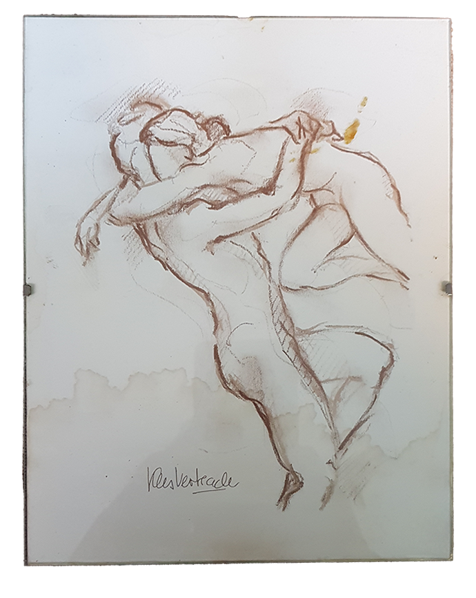 Kees Verkade (1941–2020) Kleine gesigneerde prent naar een tekening van Kees Verkade, die vaak als voorstudie diende voor zijn beeldhouwwerken. Ingelijst en in redelijke staat.