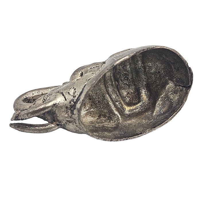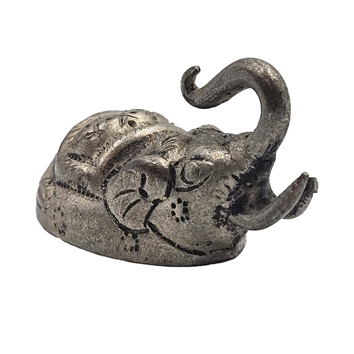 Miniatuur olifantje in liggende houding, gegoten uit metaal met fijn ingekraste details. Het ontwerp en de houding doen denken aan traditioneel Indiaas of Zuidoost-Aziatisch vakwerk, waar de olifant symbool staat voor kracht, wijsheid en geluk. Vermoedelijk midden tot late 20e eeuw, vaak verkocht als tempelsouvenir of geluksbrenger.