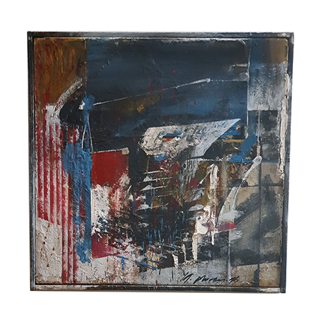 Petru Lucaci (1956)– “Semn” (olieverfschilderij, 1996, abstract) Roemeense kunstenaar internationaal geëxposeerd. Gesigneerd “P. Lucaci 96” en op de achterzijde voorzien van titel en naam. Uitgevoerd op doek, met eenvoudige houten lijst. Conditie goed.