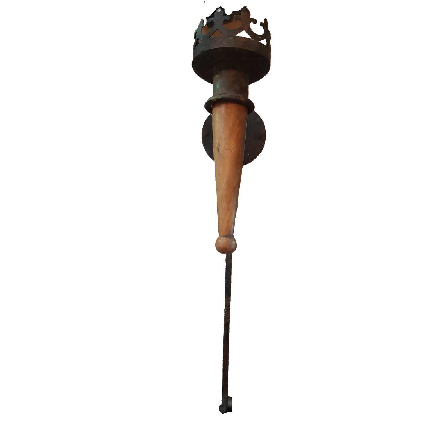 Set van twee gietijzeren en houten wandfakkels, elk 50 cm hoog. Decoratief, robuust en in goede staat. Opvallende blikvangers voor binnen of buiten.