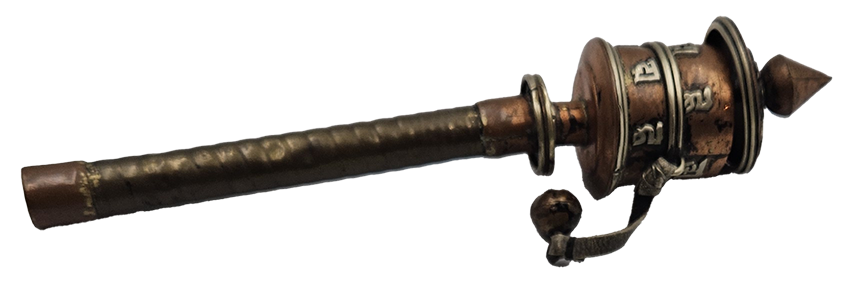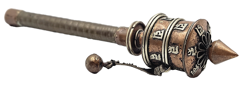 Authentieke Tibetaanse gebedsmolen (mani wheel) van koper en messing, met mantra’s in reliëf rondom de trommel. Uitgevoerd met metalen ketting en gewicht voor soepele rotatie tijdens meditatie en gebed. Traditioneel handgemaakt, vermoedelijk Nepal of Tibet, midden 20e eeuw.