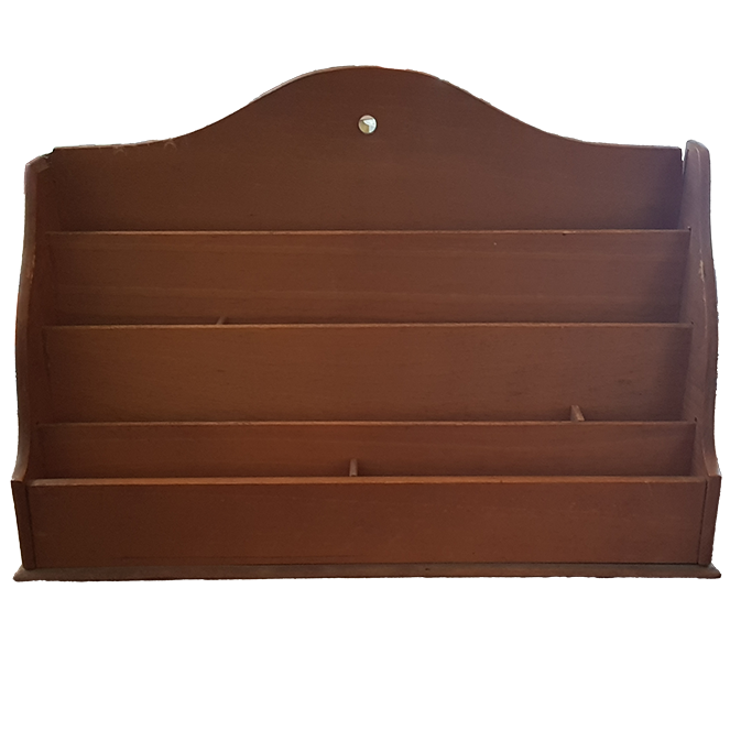 Vintage houten opbergbakje of brievenhouder met drie niveaus. De vakverdeling is verstelbaar. Geschikt voor post, kaarten, recepten of bureau-opbergruimte. Ophangoog aan de achterzijde.