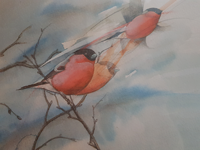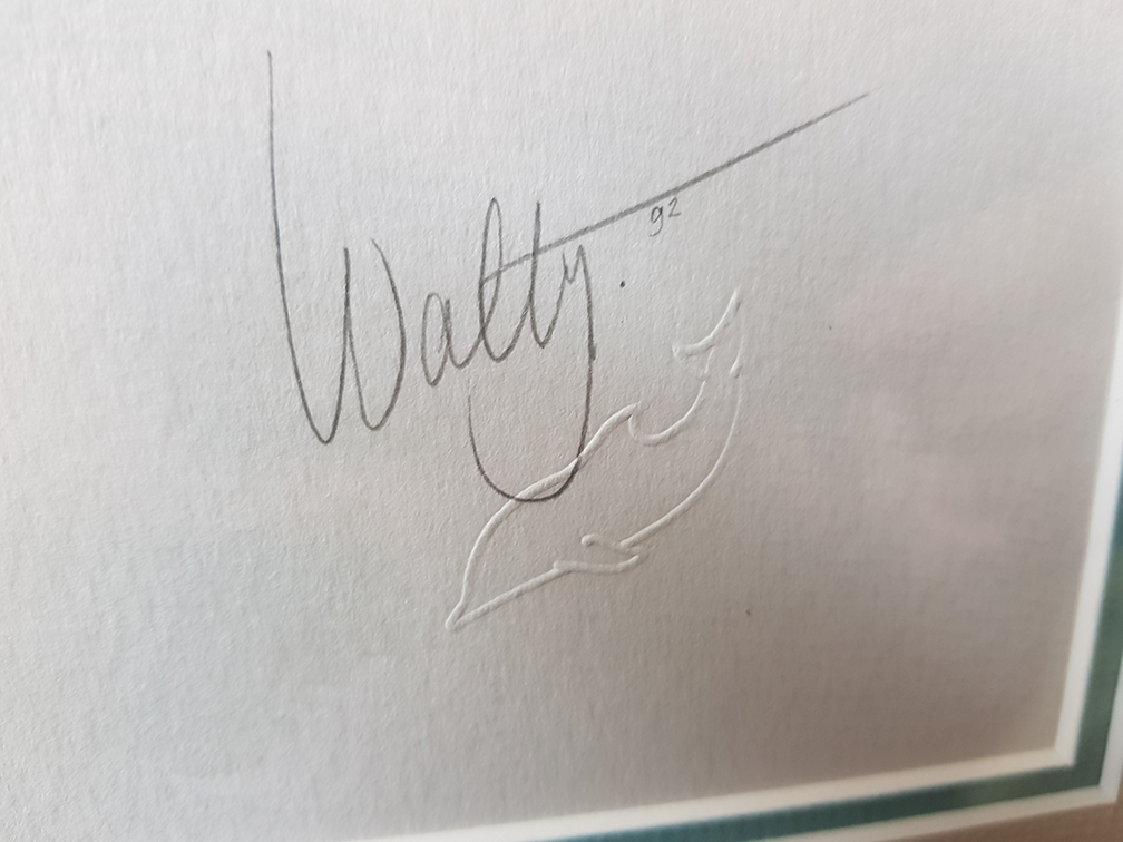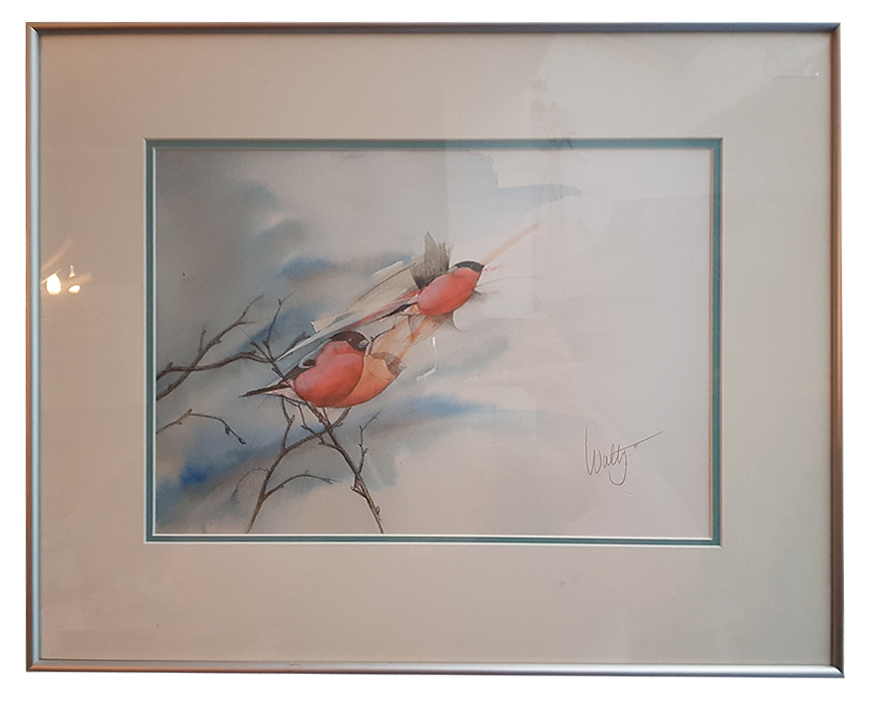 Walty Dudok van Heel – Goudvinken (1992) Aquarel van twee goudvinken op een tak, potloodgesigneerd (met blindstempel en dolfijnmotief). Bekend om haar fijnzinnige natuuraquarellen in lichte, transparante tinten.